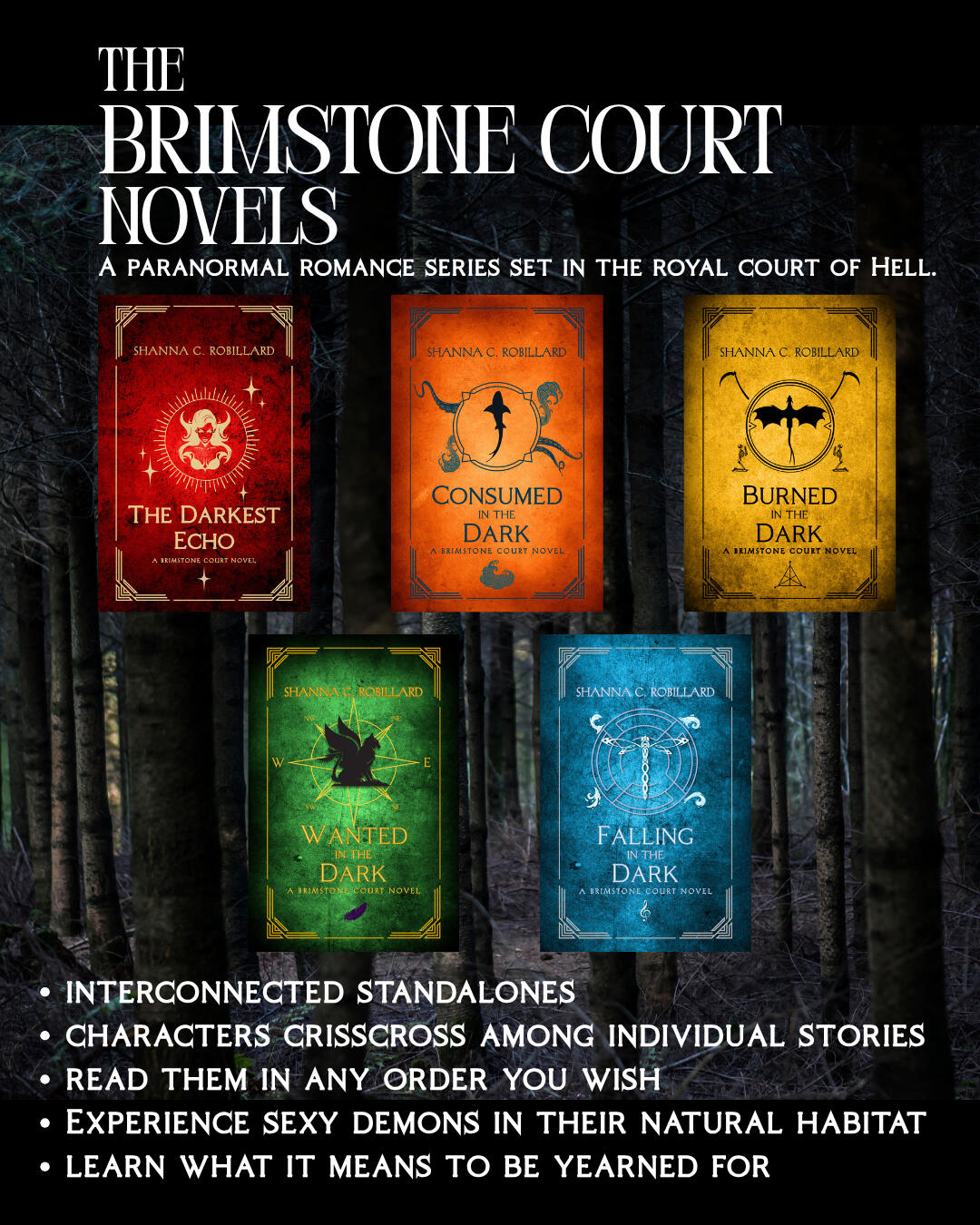 Sirena Dubois is being hunted.Centuries ago, her ancestor enslaved a violent demon to their whim, but the abuse of the dark being didn’t stop there. Generation after generation of her family used the dark being for their own nefarious purposes. When it escaped hundreds of years later, it vowed to enact revenge—and it has been hunting her family ever since.28 years after her parents disappeared, Sirena's time has come. The demon has her in it's sights, and she runs in the middle of the night, leaving her life and foster-sister behind. In fear for her life, Sirena remembers her parents' stories and calls on Lilith for help. Recognizing the evil the woman is facing, Lilith agrees to protect her, assigning her a demonic guardian named Utor.At first, Sirena is uncomfortable: he's always around and trying to take care of her. Decades of self-reliance taught her to hold everyone at arm's length, but he's swiftly breaking down those walls she set up around her heart.Then a single moment destroys it all. Sirena learns Utor is a shifter—just like the demon hunting her. Even worse, his shifter side is terrifying. How can she possibly trust him—with her life or her heart? Can she ever see beyond his shifter side? More importantly, can he keep her alive?Experience Book Two of the Brimstone Court novels and the story of Sirena and Utor. Try not to be Consumed in the Dark.